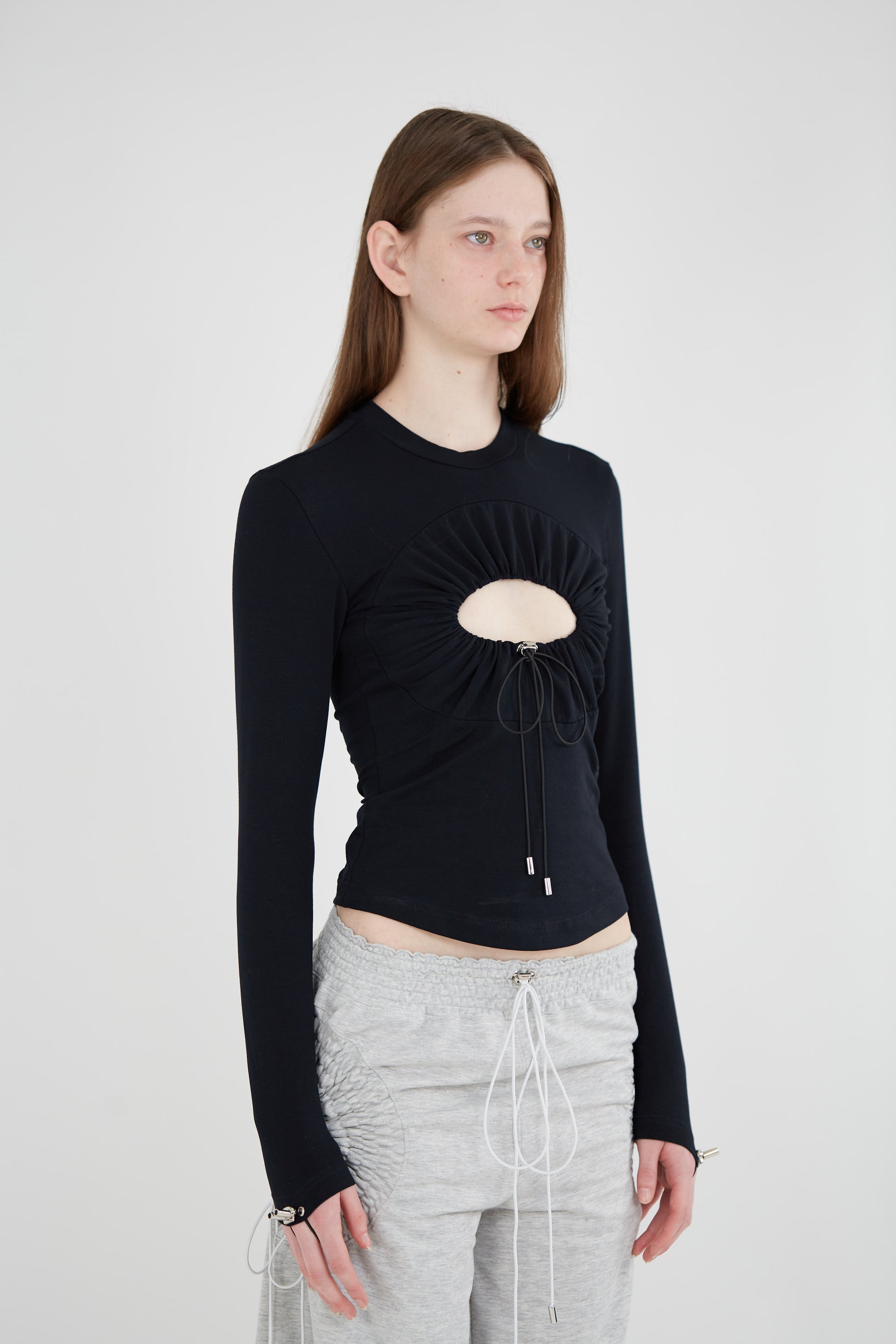 100% cotton jersey T-shirt with gathered chest detail and finger-loop with hardware detailing.